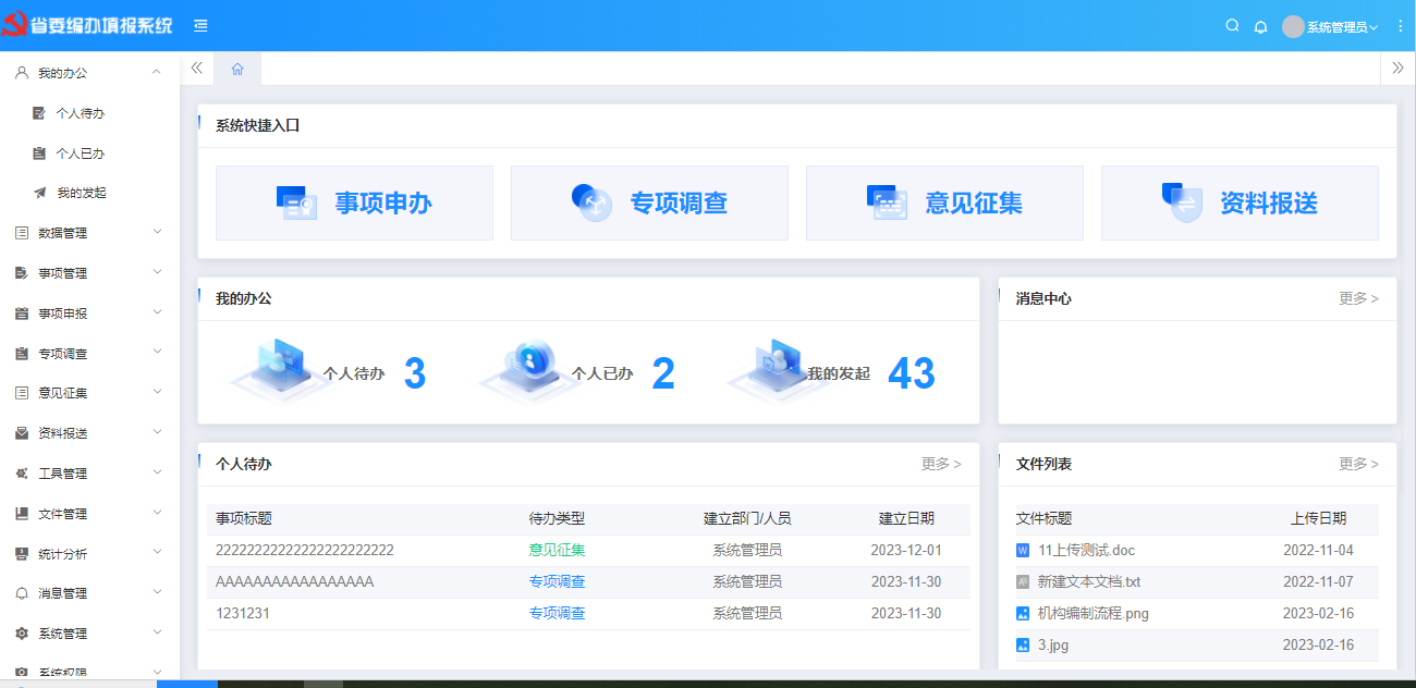 基于政务外网环境的在线机构编制动议申报系统;包含数据管理、事项管理、专项调查、专项调查、意见征集、资料报送、工具管理、文件管理、统计分析等等。